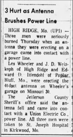 Lou Mayes: I was a friend of JD and he told me about it. His feet got burnt is all that happen to him. I also think it was the aluminum ladder that fell against the power line. The location was at the intersection of Carol Park and Old Gravois at Les Wheeler's home. That is all the info I have about the accident. JD Has passed away last year. (2019)